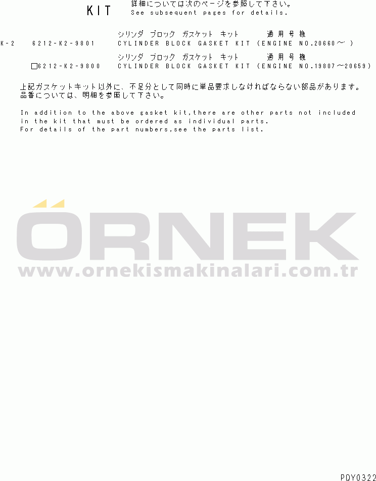 Main Part | : | CYLINDER BLOCK GASKET KIT(#19807-) | |